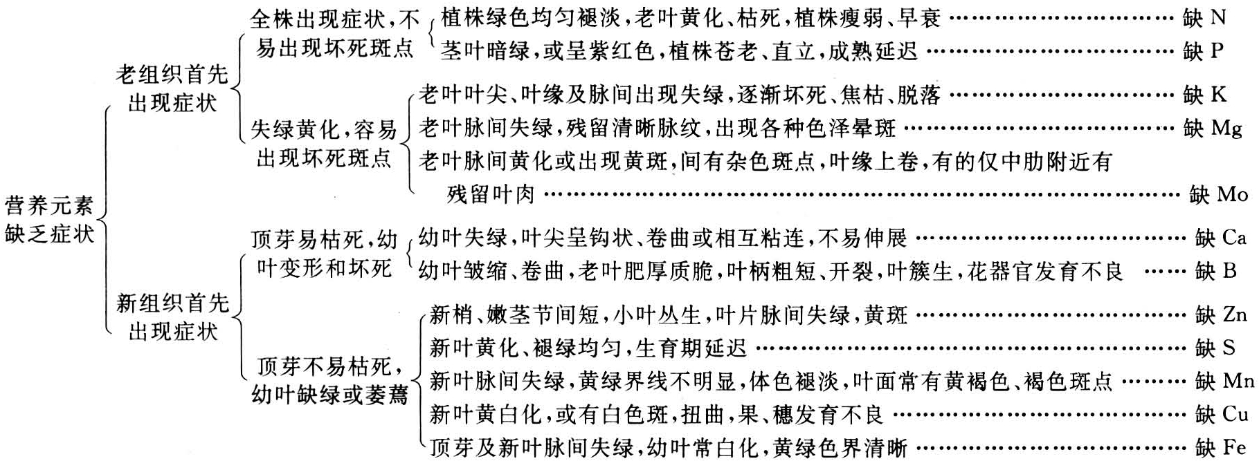 根据经验制定出一些农作物主要营养元素缺乏症的诊断检索表(见表),在实践中具有指导意义。
