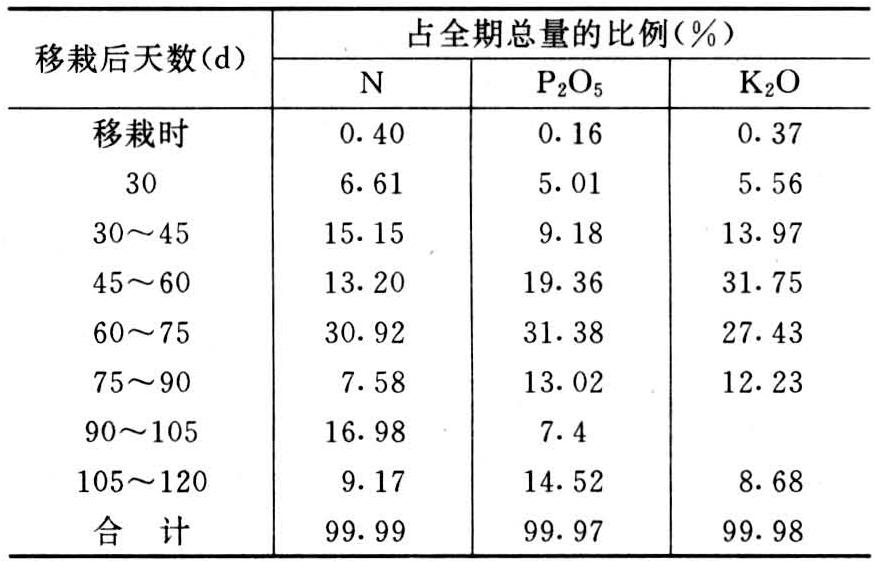 的品质,施肥对烟叶中这些物质的合成起决定性作用。烟草是移栽的作物,育苗期烟草的需肥特性不同于大田阶段。 表2 烤烟(春烟)移栽后不同时期对■、磷、钾的吸收 苗床期烤烟苗床阶段。苗床期烟苗对氮、磷、钾的吸收特性见表1。烟苗在十字期以前吸收氮、磷、钾的数量不多,以后逐渐增加,以移栽前半个月吸收量最多。这对移栽后烟苗的成活及初期生长是有利的。烟苗对养分的吸收与根系及地上部分的生长有密切关系。