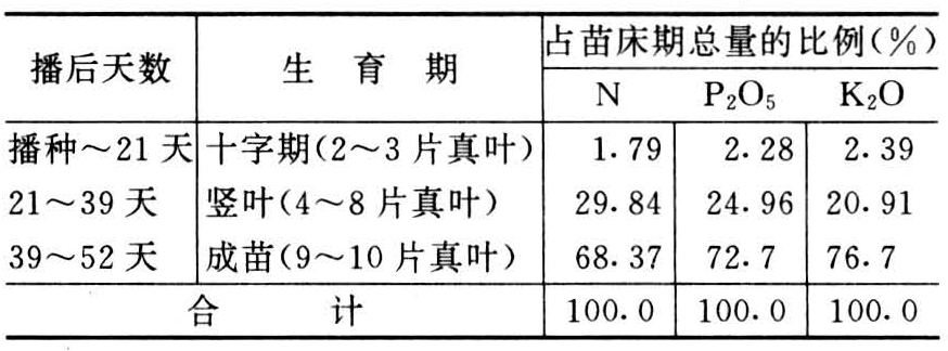 烤烟苗床阶段。苗床期烟苗对氮、磷、钾的吸收特性见表1。烟苗在十字期以前吸收氮、磷、钾的数量不多,以后逐渐增加,以移栽前半个月吸收量最多。这对移栽后烟苗的成活及初期生长是有利的。烟苗对养分的吸收与根系及地上部分的生长有密切关系。烟苗到第二片真叶出现时才长出二级侧根,这时须根尚未长出,所需的养分大部分仍来自种子。苗床期烟苗的地上部分生长极其缓慢,是长根的时期。到第七片真叶出现时烟苗才长出完整的根系,同时也形成一定的叶面积,幼苗生长加快,合成能力提高,吸收养分明显增加。
