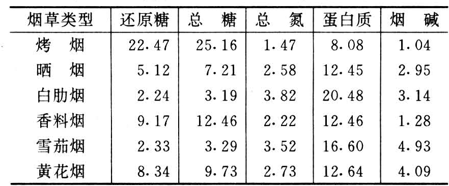 烟株现蕾后开始进入生殖生长期,叶片中物质的分解过程加强,分解产物向生殖器官中转运。生殖器官的形成要消耗叶中的营养物质,降低烟叶的品质。所以,在烟草生产中这时要打顶、抹杈,使更多的营养物质积累在叶中,打顶还能促进根系的发育,增强根系对养分的吸收及合成烟碱的能力。如果前期施肥适当,通过打顶即可把烟株的吸氮高峰和硝酸盐还原代谢转向淀粉的积累代谢的过渡期调整到现蕾至平顶前,使下部的叶片渐次成熟,这时烟株即进入成熟期。烟株不同部位的烟叶是从下而上分期成熟的,一片烟叶从幼叶出现到成熟、采收,约需60天左右。烟株打顶后不久,烟株下部的烟叶(脚叶)即将成熟、采收,春烟到移栽后120天才能全部收获完。烟叶从旺长期到叶内干物质积累达最高峰时为工艺成熟期,通称成熟期。工艺成熟的叶片通常含有80%以上的水分,10%~20%的干物质。采收下来的鲜叶在烤房烘烤的过程中,首先变黄。在变黄期烟叶中的淀粉和双糖在酶的作用下强烈分解成葡萄糖、果糖,可溶性糖大幅度增加。到变黄后期,淀粉含量由原来的30%左右减少到5%或更低一些,可溶性糖由5%增到20%左右,可见,鲜叶中碳水化合物适当高一些对提高烟叶品质有利。在大田后期,烟株氮素营养水平如果过高,会使鲜叶中的碳水化合物含量降低。在烘烤的变黄期,鲜叶中的蛋白质的分解量可达原来的20%左右。分解产物为氨基酸,氨基酸进一步脱氨,形成有机酸和氨,这些产物也能改进烟草的品质。如果蛋白质、淀粉及其他成分没有充分降解和转化,烟草品质则较差。各种类型烟叶的主要化学成分见表3。由表3中可见,烤烟叶的蛋白质含量最低,总糖量最高,因此,烤烟适宜在肥力水平较低的土壤上种植;白肋烟叶中的蛋白质含量最高,总糖量最低,所以,白肋烟对氮素营养水平要求较高,适合在较肥沃的土壤上种植。