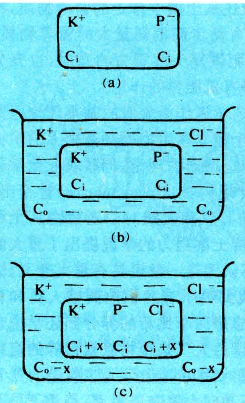 是F.G.杜南(Donnan)提出的一种特殊的积累离子的现象。细胞原生质内含有可解离的大分子,例如蛋白质分子。它不能扩散到细胞质膜外,是非扩散性离子,按杜南平衡的原理,不需消耗能量,细胞内就可逆浓度梯度积累K+等阳离子。这种情况和一般扩散不同,可用图说明。图中表示将含有蛋白质钾盐的细胞置KCl溶液中,开始时,[K+]外=[C1-]外,均为C0;[K+]内=[P-]内,均为Ci。由于细胞内无Cl-,Cl-即从细胞外介质扩散到细胞内,同时K+也伴随Cl-向细胞内扩散;但P-为非扩散性离子,不能扩散到细胞外。因此,细胞内可积累从介质中扩散到细胞内的一些K+(图中以x表示其浓度)。使细胞内K+浓度高于细胞外K+的浓度。这样以杜南平衡的方式在细胞内积累离子不需供应代谢能,也是被动吸收离子的一种方式。