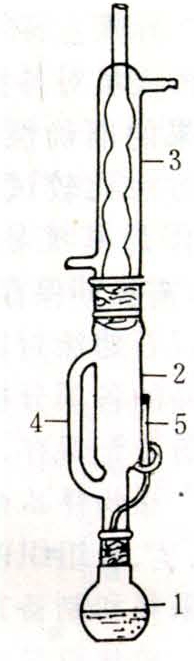 常用的提取方法有:①震荡提取法。将样品与提取剂置于锥形瓶中于震荡器中震荡提取。此法简便,适用于各类样品的有效态成分与有机成分的分析。②组织捣碎提取法。将样品置于组织捣碎机中,加入适当的提取剂,在捣碎机的高速旋转切削下进行提取。此法快速,适合于生物样品的有机成分的分析。③索氏(Soxh-let)提取法。将样品置于滤纸筒内,放入索氏提取器(图2)的浸提器中,加热盛有有机溶剂(提取剂)的磨口烧瓶,蒸气由侧管进入冷凝器,冷凝为液体,滴入浸提器。当溶剂积聚至超过虹吸管高度时,提取液会自动全部导流入烧瓶中。如此反复循环,最终将待测有机成分全部抽提出来,积留于烧瓶中。此法提取效率高,但较费时,适合于脂肪和农药残留等的分析。