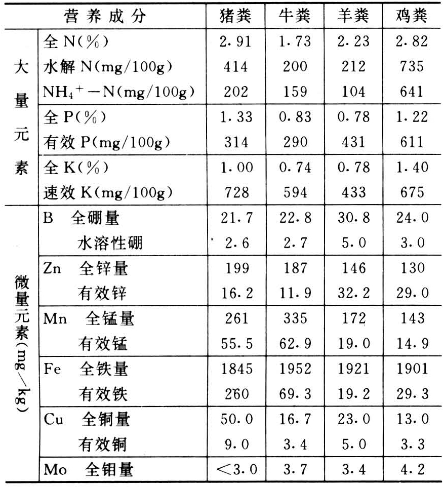 表1 几种畜、禽粪的无机营养成分