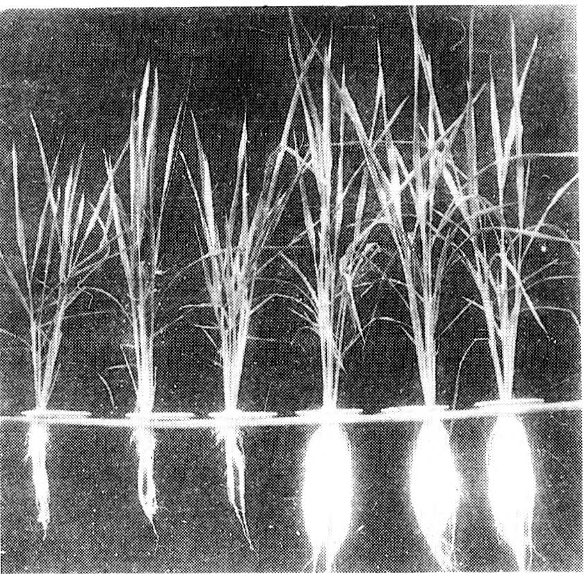硅是稻、麦等禾本科植物所必需,硅沉积在茎、叶的表皮层内,可增强植株抗病虫害能力,且使茎秆坚韧,叶片较直立,群体能截获更多光能;又能防止倒伏;硅还可阻止Mn过多的毒害。图1是缺硅及供给硅的水稻植株的б较。除稻、麦、甘蔗等禾本科植物外,已发现硅对番茄、黄瓜、菜豆、大豆及草莓也有一定效应。缺硅时在生长早期虽无明显影响,但到生殖生长期就使受精能力减弱,果实数及果重明显降低。
