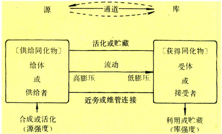 源和库在控制整个植株同化物的运输和分配方面的密切关系。“源”是指产生或供应有机物的器官或组织。如成长的叶子,或植株绿色部分,它们制造并供应其他器官同化产物。“库”是指消耗或贮存同化物的器官或组织。如幼叶、茎尖、根、种子、果实、块根、块茎等。源与库通过维管组织相互联系。其本质特性是由它们输出或输入同化物的能力所决定(图)。库对源有反馈作用,能调动源内有机物向其转移。运输流畅是指输导系统内液流畅通,是以源端物质的不断输出和库端的及时利用和贮备为前提。如果库端不能充分容纳与利用源端的同化物时,则同化物不能及时从通道上部卸出,源端同化物的供应及继续合成过程就会减弱,引起反馈抑制,使光合作用降低。