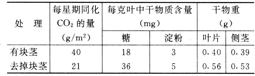 作物产量主要受库的容量和强度的限制。库的容量指穗数、果实数和块茎数。强度指光合产物及矿质元素在库里转化为结构物质和贮藏物质的能力。在同化物运输分配中,库对源有反馈影响。在生殖生长期,如摘除重要的库(果实、种子和贮藏器官),光合产物的输出受阻,叶片的光合速率亦随之下降。例如在马铃薯块茎形成期去掉块茎,则叶片中糖和淀粉含量增多,出现反馈现象,结果净光合速率大大降低,CO2同化量减少。与有块茎的植株相б,叶片干重增加,叶片增厚,侧茎增长(表1)。