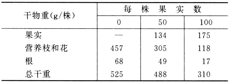 在生殖生长期,几种库同时竞争光合产物,各库间对同化物将会产生相互争夺现象,而果实、种子和贮藏器官是占优势的库。在库限制的条件下,竞争作用是表现在其他库的生长速率减低。其简单的模式为:在占优势的库中,韧皮部卸出速率较高,这与植物激素代谢是相联系的,导致韧皮部中由其他库提供的溶质流较快地移向该库。例如柑橘树在果实发育时库的竞争十分明显。当果实负荷量增加时,营养枝条和根的生长显著降低(表2),同时植株的总干重减少。这说明总干重受果实负荷量的影响б受光合产物分配影响要大。