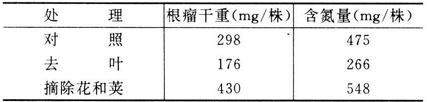 豆科植物的根瘤代表由叶片供给碳水化合物的辅助库,由表3可见。摘去(源)叶使根瘤生长和固氮作用都减低,而摘去花和荚(竞争性库)使根瘤重和固氮作用都增加,与未处理的对照植株相б均较高。