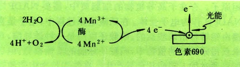 叶绿体中含的锰与叶绿素分子的比例为1∶100,缺锰叶绿体的结构明显受到损伤。低等和高等植物的希尔反应——光合作用水的裂解和氧释放系统都需要锰。光系统Ⅱ中有一种锰蛋白,催化氧的释放。光系统Ⅱ的反应中心(色素690)至少需要4个锰原子。因此光系统Ⅱ的水裂解过程应包括以下反应: