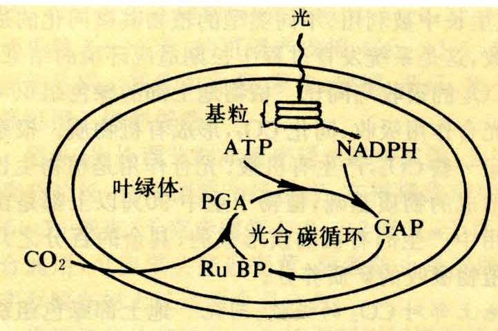 这类植物在光合作用中吸收CO2最初形成的产物为3-磷酸甘油酸,它是一种三碳化合物,故称C3植物,大部分温带植物都属这一类,其CO2同化是通过光合碳循环途径,亦称卡尔文循环(Calvincycle)途径。因其初产物为C3化合物,故又称C3途径。整个循环在叶绿体内进行。CO2的受体是1,5-二磷酸核酮糖(RuBP),它固定CO2形成3-磷酸甘油酸。催化这一羧化反应的酶是RuBP羧化酶,它既催化RuBP的羧化反应,又催化它的加氧反应,故该酶又称为RuBP羧化酶—加氧酶(Rubisco)。催化羧化反应时促进光合作用,催化加氧反应时则促进光呼吸。光呼吸是绿色细胞在光下以乙醇酸为呼吸底物释放出CO2的过程。可用右式表示Rubiscc的作用: