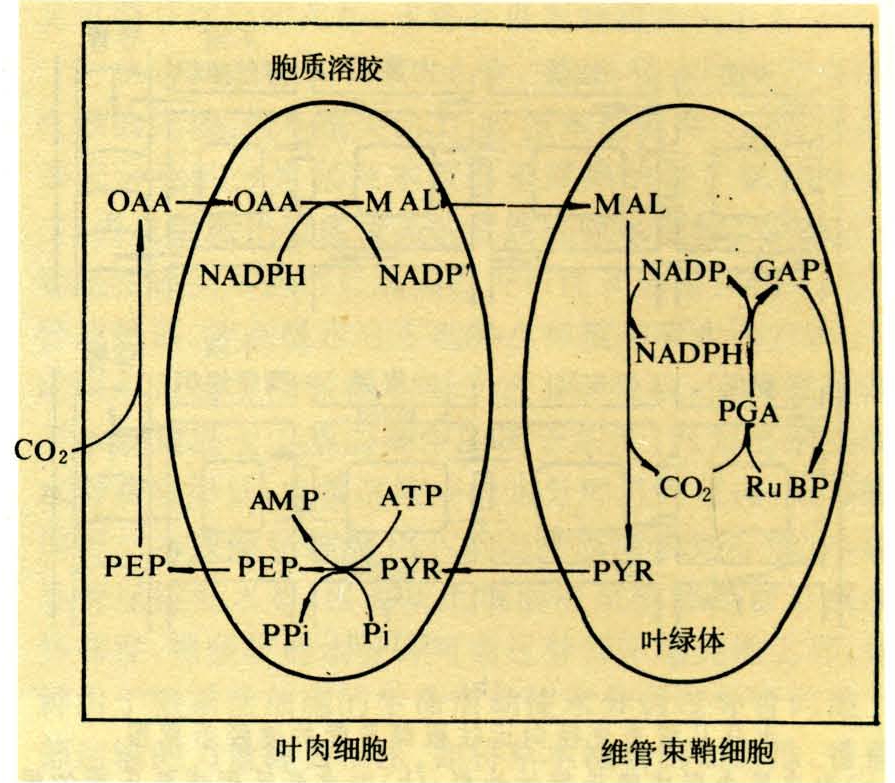 在光合作用中吸收CO2后最初形成的产物为草酰乙酸,它含有四个碳原子,故称C4植物。这类植物多起源于热带,其中包含很多生活力很强的杂草。农作物中的玉米、高粱和甘蔗也属于C4植物。这类植物在解剖结构和生理方面都有其特点,围绕着维管束具有两层不同结构和生理功能的光合细胞,其内层为维管束鞘细胞,外层为叶肉细胞。进行光合作用时,先在叶肉细胞内固定CO2,形成C4-二羧酸。C4-二羧酸从叶肉细胞转移到维管束鞘细胞,在那里脱羧,又释放出CO2,所释放的CO2即进入维管束鞘细胞内的光合碳循环。按维管束鞘细胞内催化脱羧反应的酶的种类不同,C4植物又分为三类:①通过NADP专一的苹果酸酶脱羧的植物为NADP-ME型。例如玉米、高粱、甘蔗;②通过N AD专一的苹果酸酶脱羧的植物为NAD-ME型。例如稷、马齿苋;③通过PEP羧激酶脱羧的植物为PCK羧激酶类型。例如大黍、虎尾草。图3所示玉米、高粱、甘蔗(NADP-ME型的C4植物)的CO2同化途径。