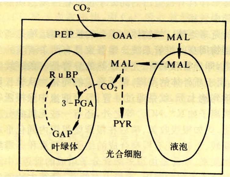 acid metabolism,CAM)植物 这类植物起源于热带或亚热带,长期适应了高温、干旱的环境,大部分的茎或叶是肉质的,它们具有一种特殊的CO2吸收与同化的方式。这种方式首先在景天科植物中发现,故称这类植物为CAM植物(例如仙人掌和景天)。CAM植物的气孔夜间开放,在夜间吸收并固定CO2,形成苹果酸,并贮存在液泡中;白天气孔关闭,可以减少水分消耗;夜间贮备在液泡中的苹果酸在白天从液泡中转移出来,脱羧释放出的C O 2通过光合碳循环形成碳水化合物(见图4)。CAM植物光合作用中CO2的受体也是磷酸烯醇丙酮酸(PEP),固定CO2后也形成C4二羧酸草酰乙酸(OAA),OAA再还原成苹果酸(MAL)。这段途径与NADP-ME类型的C4植物相同,但区别在于这类植物是在夜间吸收并固定CO2为C4二羧酸,白天脱羧释放出CO2并同化为碳水化合物,有昼夜的分隔;C4植物则是不同类型细胞的分隔。这些都是在系统发育过程中形成的适应性。