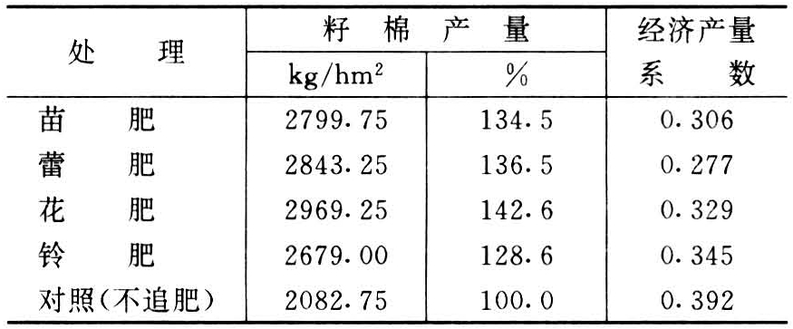 作物需要养分最多,且施肥能获得最大效应的时期。营养最大效应期往往在生长最旺盛时期,这时作物吸收养分的绝对量和相对量都最多,如能及时满足作物对养分的需要,增产效果非常显著。水稻氮肥的最大效应期在幼穗形成期,玉米在抽雄初期,冬小麦在拔节至抽穗期,大豆、油菜在开花期,棉花在盛花始铃期。棉花不同时期施用氮肥的试验结果表明,以花期追施氮肥效果最佳(见表)。各种营养元素的最大效应期不完全相同。