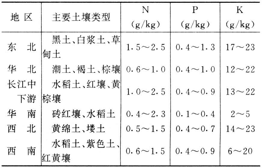 中国土壤养分的含量和有效养分水平。土壤养分的总贮量代表土壤养分的潜力,而有效养分水平则直接影响施肥措施。中国土壤氮(N)、磷(P)、钾(K)的含量土壤氮磷钾的含量(全量)受成土母质、生物气候条件以及人为耕作施肥措施的影响。下表中列出了中国主要地区土壤中大量元素的一般含量变幅。 中国主要地区土壤氮磷钾含量 土壤氮素根据对中国2555块耕地土壤的统计,其变幅为0.4~3.8克/千克N,平均值为1.