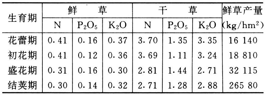紫云英植株中氮(N)、磷(P)、钾(K)的含量因生育期、组织器官、土壤及施肥的不同而异。一般花蕾期和初花期养分含量高于盛花期和结荚期(见表)。随着生育期的变化,鲜草产量增加,氮、磷、钾养分总量亦相应增加。紫云英各组织器官的养分平均含量(以干物质计)约为N 2.18%~5.50%,P2O50.56%~1.42%,K2O 2.83%~4.30%,CaO 0.60%~1.86%,M gO 0.40%~0.93%。其中以叶和花中的氮、磷含量较高,茎秆中钾的含量较高。紫云英含有较多的蛋白质、脂肪、胡萝卜素及维生素C等营养,且纤维素、半纤维素、木质素较低,是一种优良牧草。