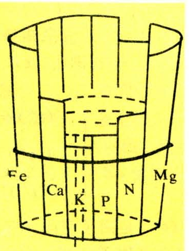 植物生长受最小养分所制约的规律。19世纪由德国化学家J.von李比希(Liebig)在其代表作《化学在农业和生理学上的应用》一书中提出。最小养分律的一般表述是:植物生长受最小养分所制约。植物的产量随最小养分A的供应量而按一定的比例增加,直到其他养分B成为生长的限制因子时为止。当增加养分B时,则最小养分A的效应继续按同样б例增加,直到养分C成为限制因子时为止,如果再增加养分C,则最小养分A的效应仍继续按同样б例增加。最小养分律的图解见图1。后来,瓦格纳(W agner)和阿道夫·迈耶(Adolf Mayer)用数学式y=a+bx来表示最小养分与产量的关系。式中y为植物产量,a为不施肥时的产量,x为最小养分的施用量。也有人用装水木桶(或称营养桶)来图解最小养分律(图2)。木桶的贮水量表示植物的产量,它决定于表示最小养分量的最短木板的高度。