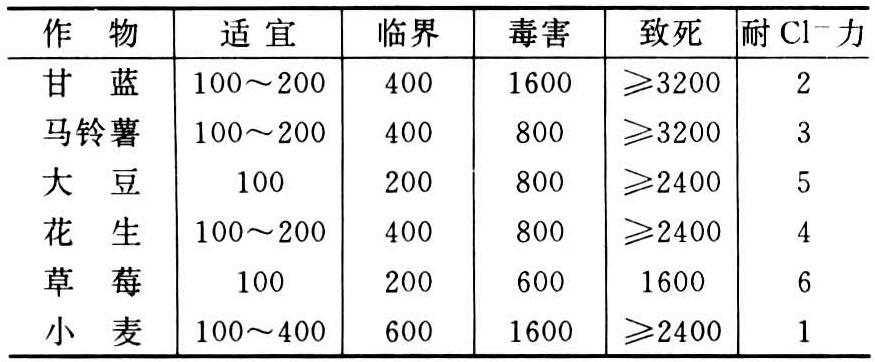 不同作物耐氯能力比较(Cl-,mg/kg)