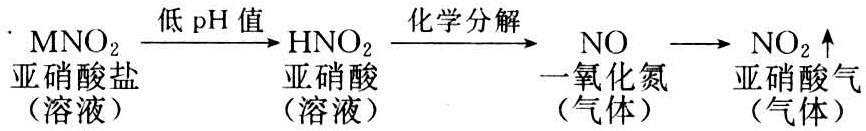 受害作物最初叶缘或叶脉间产生水渍状斑点,逐渐失绿,1~2天后变成黄白或黄褐色、枯萎。受害组织与健全组织间界线明显(见图)。受害症状通常以中位叶最严重,生长点附近的新叶一般不致受害。受害严重时在早上换气后可以眼看叶片开始慢慢萎蔫,所有作物的被害症状几乎都是如此。发生主要原因是硝化细菌活力下降,由亚硝酸(盐)向硝酸(盐)转化过程受阻,土壤中亚硝酸盐积累,并分解气体成一氧化氮逸出,再经空气氧化成二氧化氮即亚硝酸气(NO2),伤害作物。土壤中亚硝酸积累的条件是①有相当数量的肥料氮存在。②低的pH值(pH值≤5.0)。③低温。土壤中亚硝酸气气化并大量逸出往往由升温促成。所以亚硝酸气中毒以在低温条件下,天气转晴骤然升温时出现为多。由亚硝酸盐变成亚硝酸气的过程如下式所示: