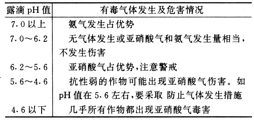 大棚栽培气体中毒的诊断可以在早晨换气之前检测附着于棚顶薄膜上露滴的pH值。在多数情况下,氨气、亚硝酸气同时存在,故应多点采样,以确定何种气体为主。判断标准见表。此法也可作检测措施,相隔一定时间测定一次以作预报;另外,口尝露滴味觉也有助于判断,舌舔露滴,有滑溜感为氨,如味涩则为亚硝酸。