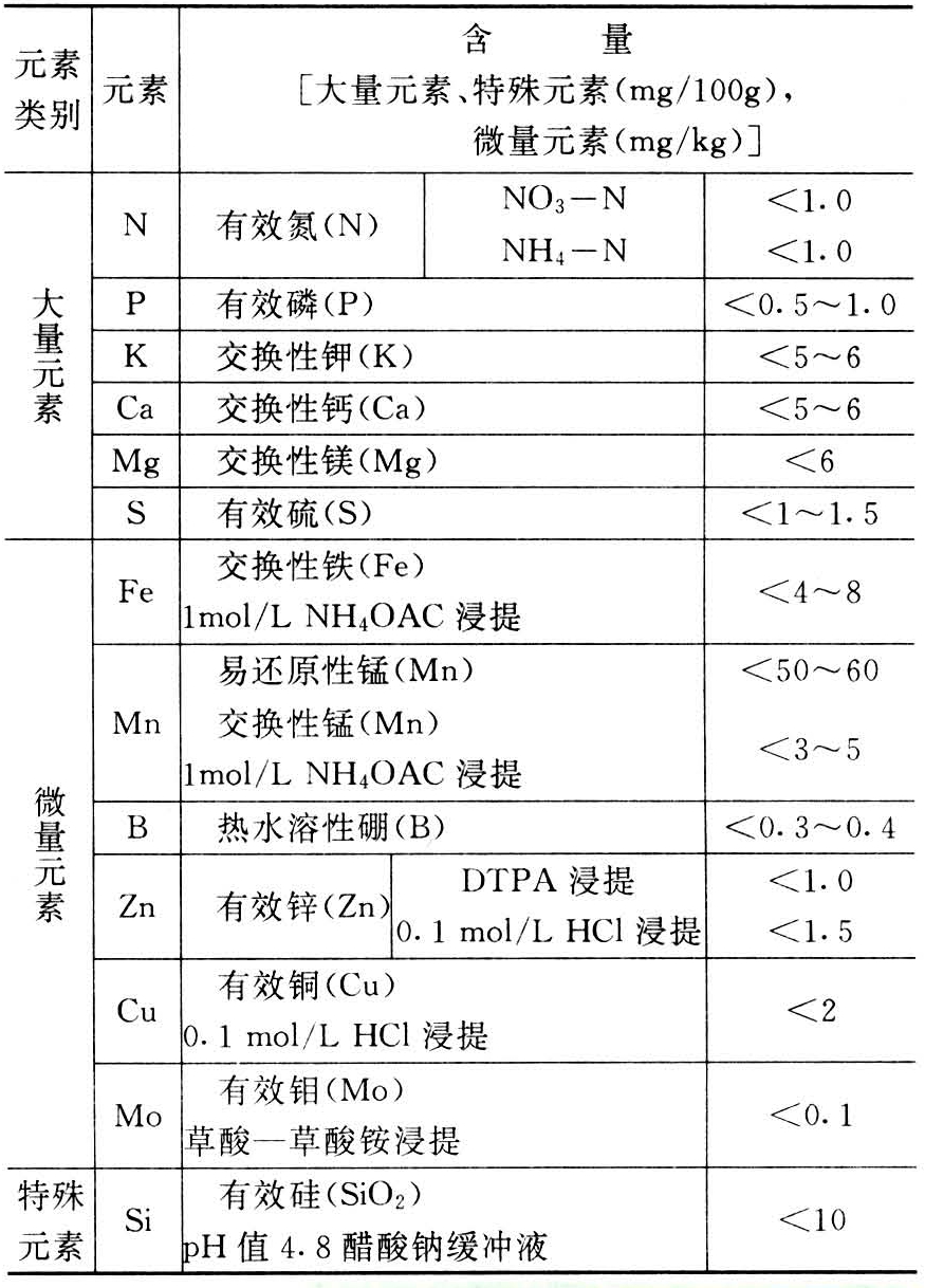 是引起缺素症的主要原因。当土壤中某种养分含量低到某一低限,作物吸收不到为正常生育所必需的数量时,必然导致缺素症的发生。表1所列为容易发生缺素症的各种养分水平。由于天气条件差异和作物种类的不同,这一水平会有较大甚至很大的差异。有效养分含量低的通常是一些偏酸、偏碱、偏砂和有机质贫乏的土壤。就不同元素看,最容易缺乏的是氮,一般农业土壤几乎普遍供氮不足;其次是磷、钾缺乏,也б较普遍;其他各种元素的缺乏一般有地区(域)性差异;氯的缺乏迄今在生产实践中还未曾发现。