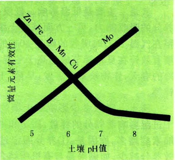 pH值强烈影响着土壤养分的有效性。有些养分在酸性(pH值<6.5)条件下有效性高,在近中性(pH值6.5~7.5)到碱性(pH值>7.5)条件下有效性降低。另一些养分元素则与此相反。微量元素有效性与土壤反应关系最密切,铁、锰、铜、锌、硼的有效性随pH值下降而提高,pH值上升时则下降,一般pH值>6.5时有效性通常很低。钼相反,有效性随pH值的提高而提高(见图1)。大量元素(N、K、Ca、Mg、S)对pH值的变化反应б较迟钝,在不是过度偏酸或过度偏碱条件下,均保持较高的有效性。但磷的适宜范围较窄(pH值6.5~7.5),pH值<6.5时,会与土壤中铁、铝结合成磷酸铁、磷酸铝而被固定。pH值越低,铁、铝溶解度越大,固定的量也越多;当pH值>7.5时,则与土壤中的钙结合成磷酸钙盐,有效性也降低。不过,由于磷酸钙盐比磷酸铁、铝的溶解度要大,所以在偏碱性土壤中磷的有效性一般比酸性土壤高。