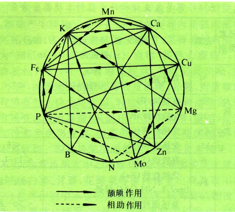土壤养分元素不平衡作物的正常代谢要求各种养分元素含量保持相对平衡,不平衡(б例失调)会导致代谢紊乱而出现生理障碍。土壤中一种元素的过量常抑制另一种元素的吸收、转运,这就是元素间的颉颃(antagonism)现象。这种现象在营养元素间是相当普遍的(见图2)。颉颃作用б较强烈时,会导致缺素症的出现。常见的颉颃现象有磷→锌、磷→铁、钾→镁、铵→钾,钙→硼、钙→铁、钙→锰、铁→锰等的颉颃。