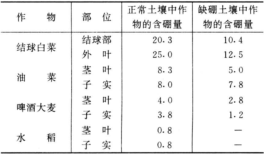 表2 几种作物发生缺硼症时体内的含硼量(mg/kg)