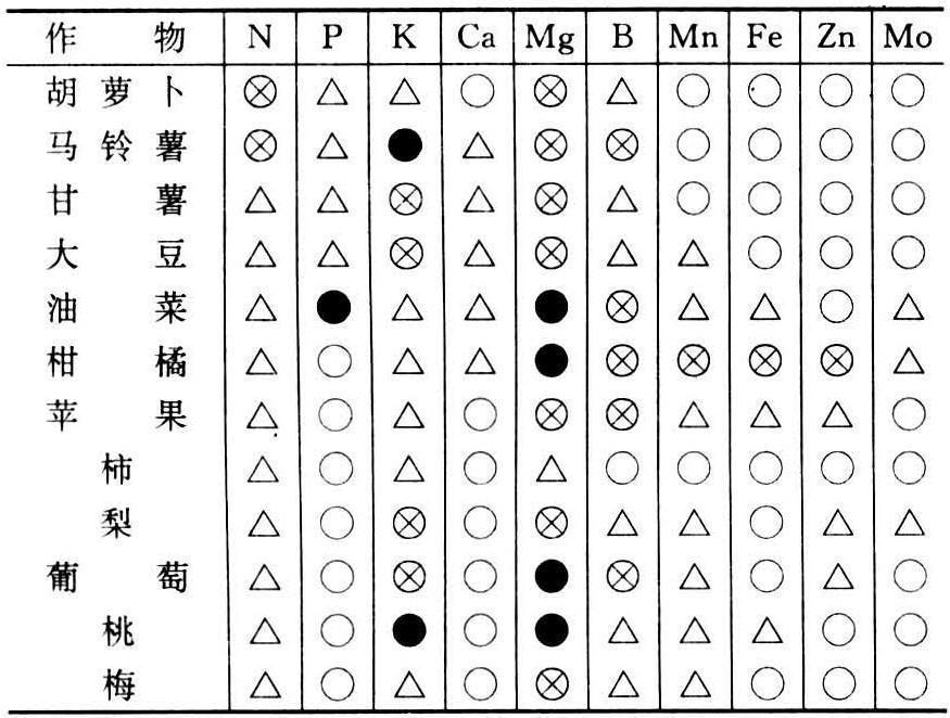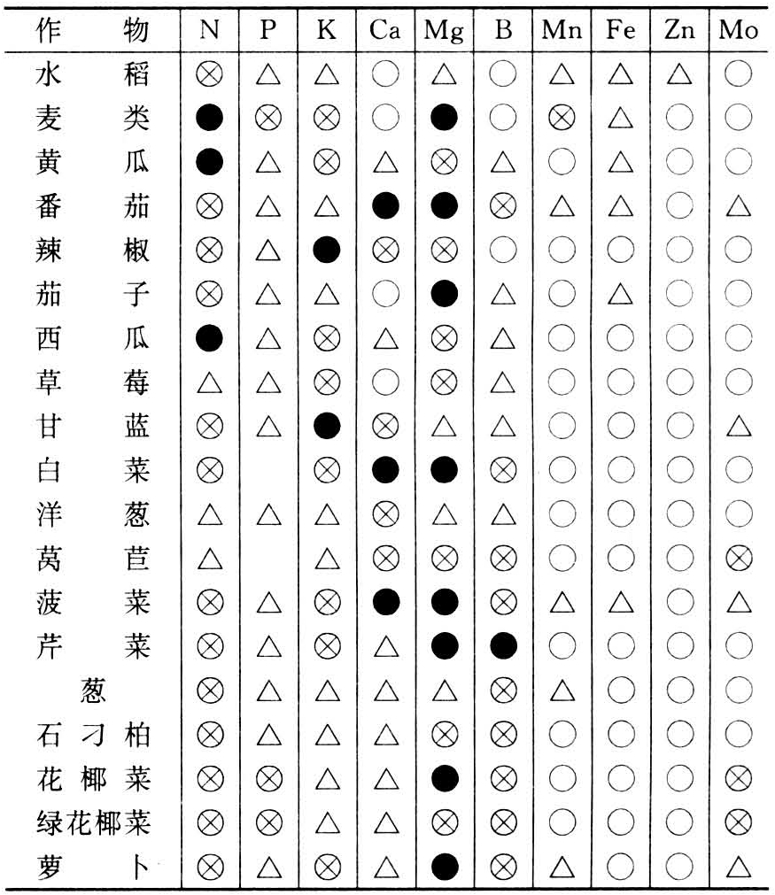 作物种不同,营养特性有别,对某些养分元素的喜好及其需求量有很大的差异。表2所列为几种作物对硼缺乏的反应。对结球白菜为缺乏的含硼水平对油菜为正常;对油菜为缺乏的对啤酒大麦为正常;对啤酒大麦缺乏的对水稻正常。此种差异一般基于作物生理需求的不同,通常以需要量大的易感不足而容易缺乏。不同作物各种元素缺乏症出现的难易见表3。这种差异在同种作物的不同品种中也普遍存在,迟熟品种常有б早熟品种容易发生缺乏的倾向。