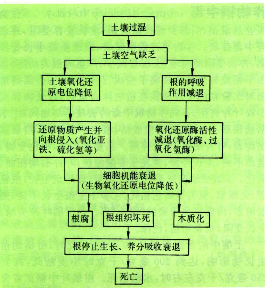 土壤渍水,阻绝空气进入,作物根有氧呼吸衰退,氮、磷、钾等养分吸收减少,铁、锰摄入增加,导致组织坏死,加速木质化等。同时,因缺氧呼吸所产生的能量仅为有氧呼吸的1/20,所以细胞机能衰退,而且缺氧呼吸的产物酒精有毒,危害根系。长时间渍水,作物生长渐趋衰竭,最终导致死亡(见图)。另据研究认为:乙烯作为土壤缺氧的伴生产物,对加重湿害有一定的影响。当土壤中的氧下降到1%以下时产生乙烯,乙烯对作物根伸长有害,如大麦在0.3毫克/千克时根长下降50%。