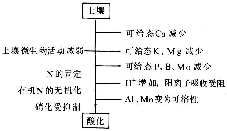 过酸土壤对作物生育的障害,其因子是多方面的。低pH值、高铝、高锰、低磷、低盐基、低钼以及土壤微生物活动衰减。有机氮矿化,氮的硝化受抑制致供氮不足等。所有各种因子都可成为作物生育不良的原因,故作物酸害的发生既可能是某一因子的作用,也可能是几种因素的综合影响。这些不利或有害因素都是在土壤酸化过程中发生的(见图解)。其中主导因素是pH值。但低pH值本身对大多数作物的影响并不重要。在溶液培养中证明,只要不存在高铝、高锰、低磷等因素时,pH值=4的溶液对一般作物生长并无明显的影响。农业土壤一般pH值都在4~8范围内,所以,通常所说的作物酸害实质上并不是低pH值直接影响的结果,而是低pH值引起的一系列理化性质恶化的综合影响。其中高铝、低磷、高锰常是酸害主要因素。