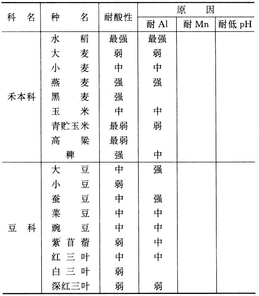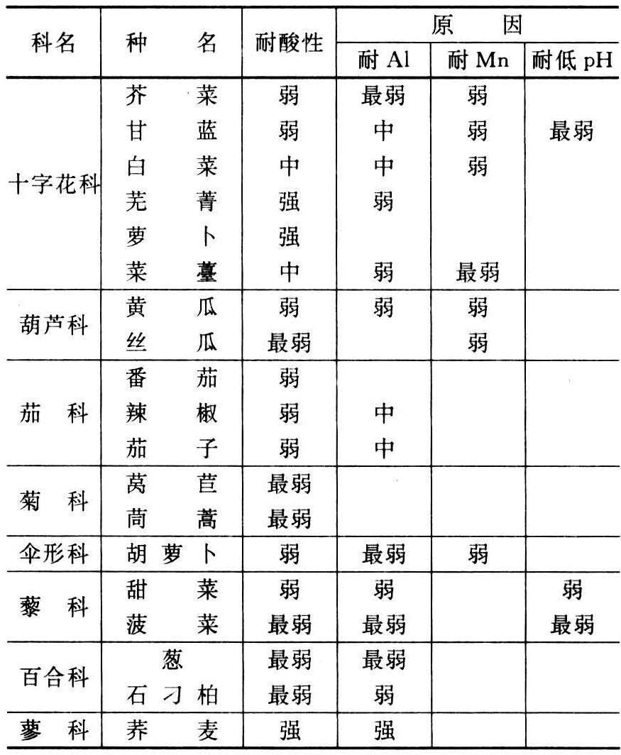 不同作物耐酸性有很大差异,有关作物耐酸性分类已经有过很多研究,从下表中可以大致看出:作物耐酸性与耐铝性存在一定程度的一致性,耐铝性强的往往耐酸也强。但也存在一定的差异,就是说,不同作物在酸性土壤上生育不良的主要障害因素可能是不同的。栽培于同一酸性土壤上,甜菜、大麦主要表现为铝毒,甘蓝可能主要是锰毒。其次,在这些作物中,按植物科属分多少也存在一些差异。其中耐酸力弱的有藜科、葫芦科、茄科、菊科、百合科中的许多种;禾本科中有较多的种抗酸性较强(除大麦、青贮玉米和高粱外);十字花科作物从强到弱都有,豆科作物多数属于中等。