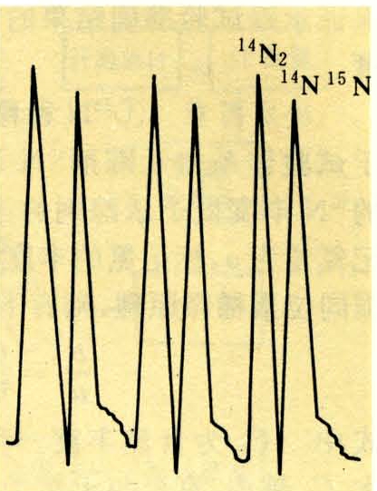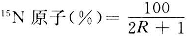 由质谱仪或光谱仪分析样品氮的同位素丰度。将氮气样品引入质谱仪或充入光谱仪的放电管中,不同同位素组成的氮气在质谱仪的电离室中电离,产生不同质量的正离子,或在光谱仪的放电管中受激发时,不同质量的氮气分子发射不同波长的光。将它们分离、接收并记录,根据信号的强度按下列公式计算15N丰度。 15N丰度测定 式中 R为质谱仪或光谱仪输出的28N2和29N2信号强度的б值即R=28N2/29N2。
