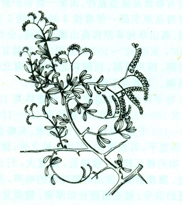 高50~80厘米,茎强烈开张并分枝,近乎平卧。树皮灰白色,小枝具贴生丝状毛。叶4~6片簇生,倒卵匙形,肉质,长2~3厘米,宽3~6毫米,顶端钝圆,具小突尖,被丝状毛。花小,直径约8毫米,黄绿色,排成顶生蝎尾状花序;核果锥状卵形,长8~10毫米,成熟时深紫色,含1粒种子(图)。