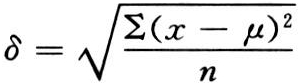 反映数据资料分布离散性的特征数。用以度量资料中各观察值偏离均数的平均变异程度。表示资料变异程度的指标较多,有极差、方差、标准差、变异系数等,其中最为广泛应用的是标准差。设一含有n个观察值x1,x2,…,xn的有限总体,平均数为μ。其总体标准差δ的计算公式为: