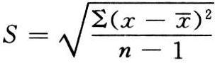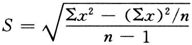 由于总体标准差δ不易求得,实际工作中常用样本标准差S作为δ的估值。对于含有n个观察值x1,x2,…,xn的样本,其样本标准差S的计算公式为: