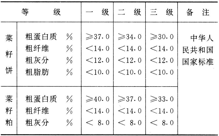 中华人民共和国国家标准《饲料用菜籽饼》和《饲料用菜籽粕》规定以粗蛋白、粗纤维、粗灰分含量为质量指标,按含量分为三级,三项成分含量均以88%干物质为基础计算,三项指标必须全部符合相应等级的规定,低于三级者为等外品(表)。
