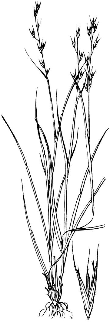 植株秋后常呈红褐色,秆直立或铺散,纤细,高10~30厘米,干后常成蜿蜒状或螺旋状弯曲。叶鞘层层包裹直达花序基部;叶舌具短纤毛;叶狭条形,长3~6厘米,扁平或内卷。圆锥花序狭窄,长4~8厘米。小穗长5~7毫米,含2~3小花。颖具1脉,第一颖长1~2毫米,第二颖长3~5毫米。外稃披针形,5脉,第一外稃长5~6毫米,先端具短芒;内稃狭窄,与外稃近等长(图)。