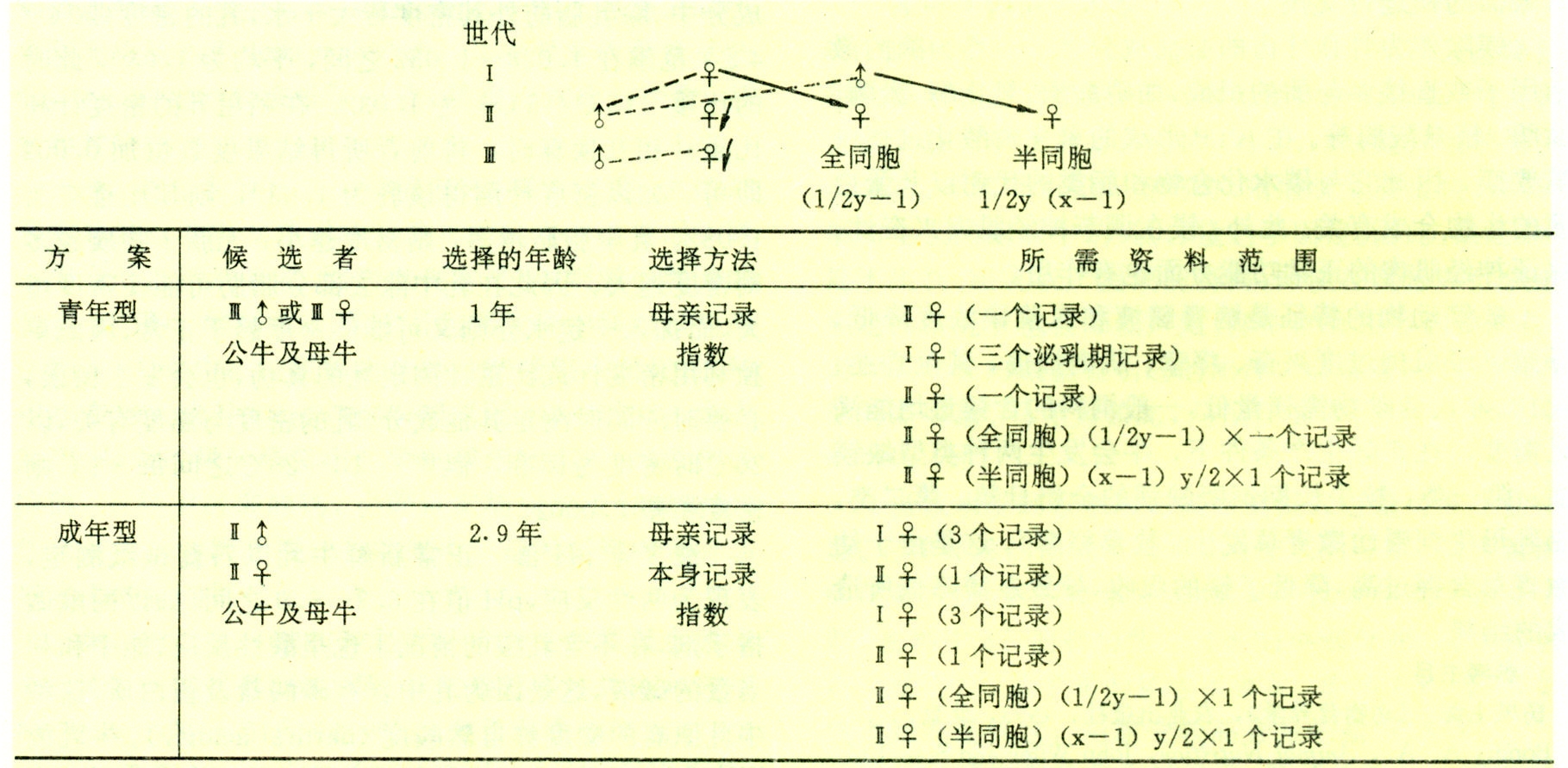 群内,但分散在胚胎收集和移植中心的周围,称为非核心MOET方案(non-nucleus MOET scheme)。在选择方法上又可分青年型MOET方案(Juvenile MOET scheme)及成年型MOET方案(adult MOET scheme)两种,其主要差异是选择时间,前者是母牛本身尚无产奶记录之前,后者是在母牛本身已完成第一个泌乳期时(表)。两种方案在选择时所需有关资料见图。
