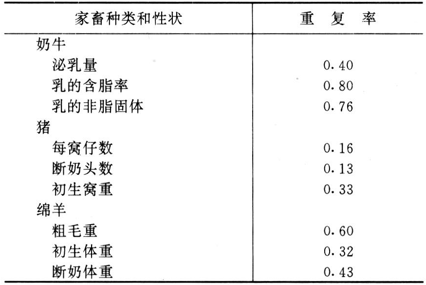 Vp,而重复率re,所以遗传力最高等于重复率(在VA=VG,VEg=0时),不可能超过重复率。如果出现h2>re,说明h2估测有误。②根据重复率可确定性状需要度量的次数(表2)。重复率高的性状根据少数几次度量就可达到较高的精确度,重复率低的性状就要经过多次度量才有比较可靠的结论。③利用重复率估计家畜终身可能的平均生产力。