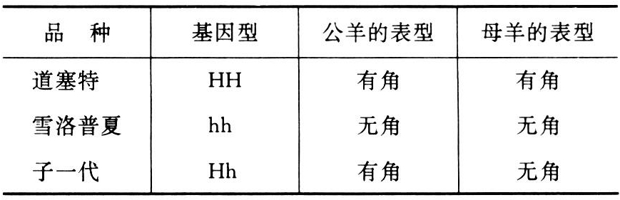 绵羊角的遗传是一例典型的从性遗传。一些绵羊品种如雪洛普夏(Shropshire)公母羊都无角,另一些品种如道塞特(Dorset)公母羊均有角。如果让以上两个品种绵羊杂交,在子一代中,公羊均有角,母羊均无角。假设H代表有角基因,h代表无角基因,亲代和子一代的表型和基因型见表。
