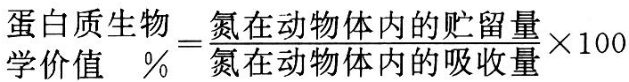 饲料蛋白质在动物体内被贮留的氮量与被吸收的氮量之比值。其计算公式如下: 蛋白质生物学价值 式中 氮贮留量=饲料氮进食量-(粪氮量-代谢性粪氮量)-(尿氮量-内源性尿氮量)氮吸收量=饲料氮进食量-(粪氮量-粪代谢氮量)由于此法需使用无氮日粮,技术上有一定困难,不易测得准确结果。