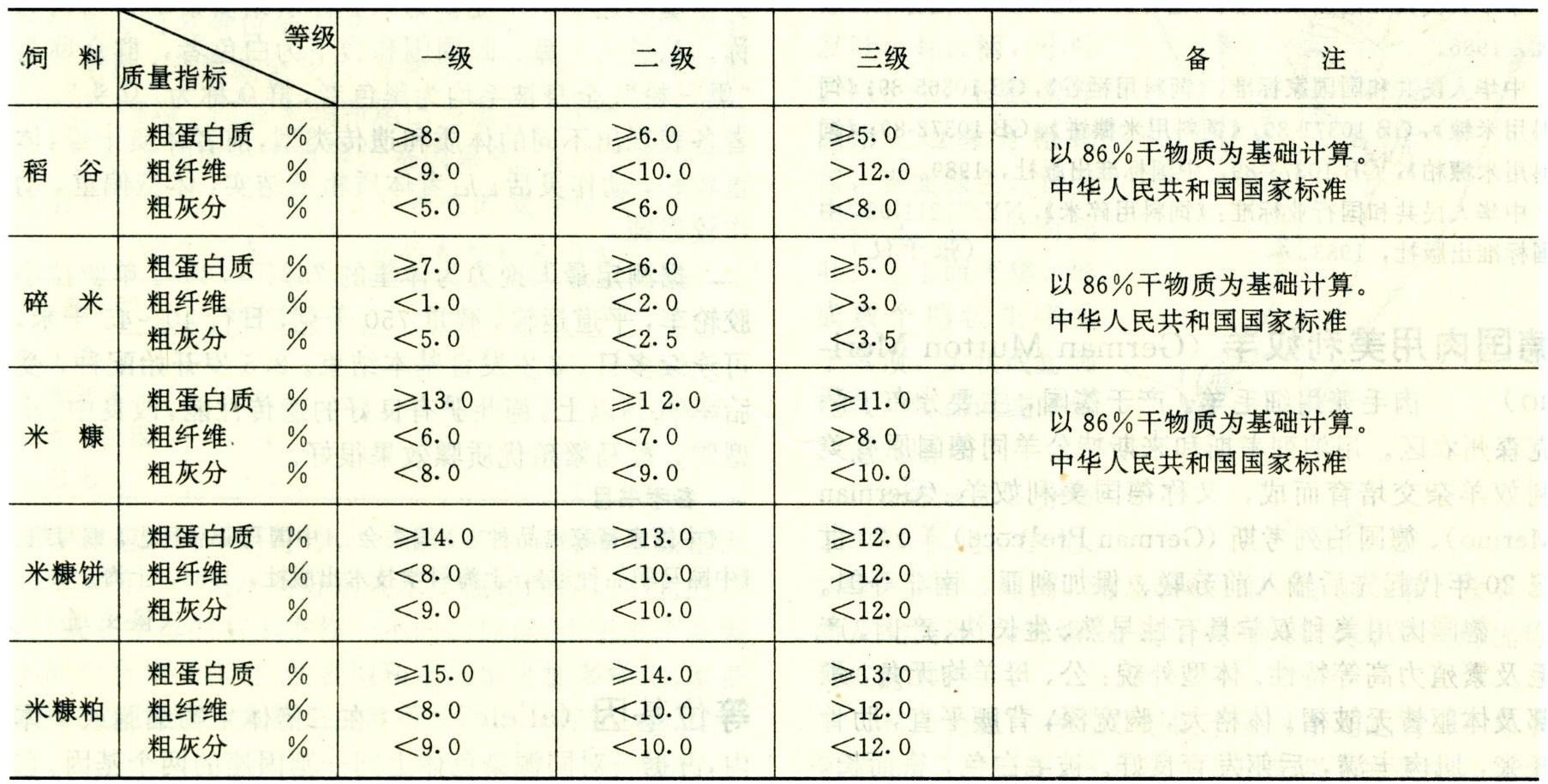 中华人民共和国国家标准《稻谷》标准中将商品稻谷按其粒形和粒质分为籼稻谷、粳稻谷与糯稻谷3大类,每类有早稻谷与晚稻谷之分,按出糙率(即净稻谷脱壳后的糙米占稻谷的百分率)及早、晚、籼、粳、糯以及不同生产地区分别分成5等。以3等为中等质量标准,低于5等者为等外品。中华人民共和国国家标准中关于《饲料用稻谷》、《饲料用米糠》、《饲料用米糠饼》、《饲料用米糠粕》以及行业标准中关于《饲料用碎米》中规定,五种饲料均以粗蛋白质、粗纤维、粗灰分为质量指标。按含量分为三级,三项质量指标必须符合相应等级的规定,低于三级者为等外品,并分别规定有相对应的水分允许量,作为计算判定质量指标的基础(表)。