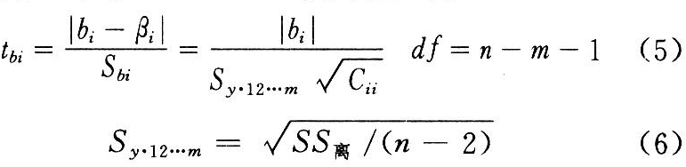式中 Sbi为偏回归系数标准误,Sy·12…m为估计误标准误(离回归标准误),SS离为离回归平方和,m为自变量数,n为变量观察数,Cii为逆矩阵主对角线元素。