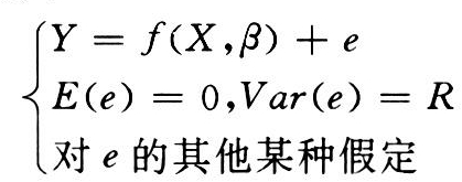 此结构称为非线性模型,其中f(X,β)为某种非线性函数。Y为一随机变量(依变量)的n次观察值构成的n维向量。X为设计矩阵,由p个变量(自变量)x1,x2,…,xp的n次观察值构成的n×p维向量,β为未知参数向量,e为随机误差向量,通常假设各观测值是相互独立且是同分布的,即e~N(0,σ2I)。这里R=σ2I,而σ2也可以是未知的,这时它也是模型的未知参数,称为误差方差。