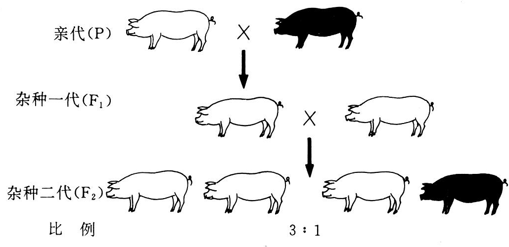 孟德尔(G.Mendle)于1857年在市场上从种子商人那里购买了34个不同品种的豌豆,开始了豌豆杂交试验研究工作。经过8年大量细致的杂交试验,于1865年在布隆城(Brünn)自然科学研究协会上报告了他的豌豆杂交试验结果,并发表了《植物杂交试验》论文。在这篇论文中孟德尔提出了分离定律和自由组合定律。后来的许多实验证明,孟德尔提出的分离定律具有普遍意义。例如猪的白毛色和黑毛色是一对相对性状,同时遗传时,即将纯种大白猪与黑猪交配,子一代仔猪全是白毛色。让子一代杂种白毛猪相互交配得到子二代,在子二代仔猪中有白毛色的,也有黑毛色的。假如统计的数量足够多,白毛仔猪约占3/4,黑毛仔猪约占1/4,两者的比例为3∶1(图1)。