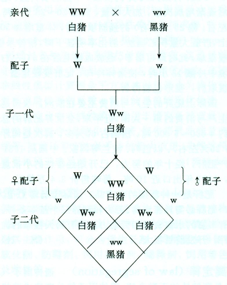 生物的性状是由内在的遗传因子(基因)所决定的。在二倍体生物体细胞中基因是成对存在的,在配子中只含有成对基因的一个。例如纯种大白猪的体细胞中含有一对决定白毛色的显性基因(WW),纯种黑猪的体细胞中含有一对决定黑毛色的隐性基因(ww)。它们的配子分别只含有一个W或w。当雌、雄性配子结合,子一代的基因型是Ww,由于W对w为显性,所以表现为白毛色。当子一代公母猪相互交配,在形成配子过程中,W和w彼此分离,产生带有W和w的两种不同类型配子,由于比例相等和活力相等,在公母猪中都一样,受精又是随机的,子二代就产生WW、Ww和ww三种不同基因型,其比例是1∶2∶1。其中成对基因相同者为纯合子,不同者为杂合子。由于W对w为显性,三种基因型表现为两种表型,即白毛色和黑毛色,其比例为3∶1(图2)。