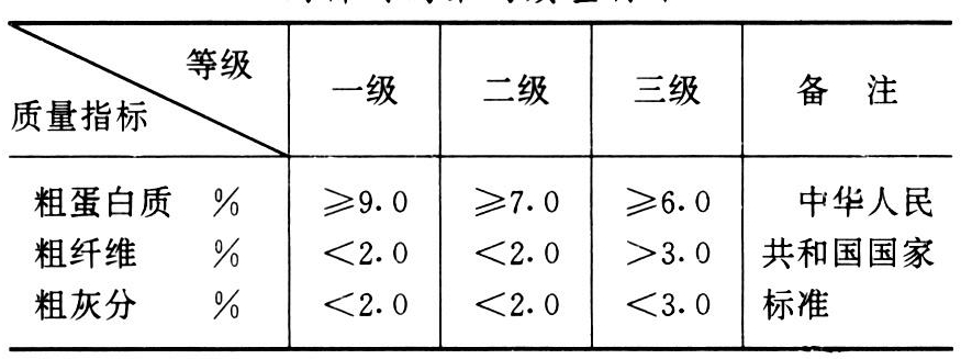 中华人民共和国国家标准《饲料用高粱》规定:以粗蛋白质、粗纤维、粗灰分为质量控制指标,按含量分为三级,各项指标均以86%干物质为基础计算,三项质量指标必需全部符合相应等级的规定,低于三级者为等外品(表)。