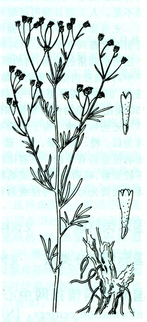 强旱生小半灌木,轴根型,高10~40厘米,茎直立或倾斜,头状花序在枝端排列成伞房或复伞房花序。茎下部及中部叶长1~3厘米,一至二回羽状或掌状全裂,小裂片狭条形或条状矩圆形,长3~10毫米;枝上部叶3~5裂或不裂。全部叶被短柔毛或分叉短毛及腺点。头状花序3~25个在枝端排成伞房状;总苞钟状或宽钟形,长4~5毫米;总苞片4层;缘花雌性,8枚,花管细管状,长1.8~2毫米,全部花冠黄色(图)。