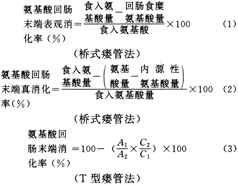 用此法测定的饲料“氨基酸消化率”受种种测试取样条件的影响极大。首先Cr2O3是以固态结晶体状况喂给,而食糜中的氨基酸则是以可溶性状态存在,二者的均匀性差,取样时会有过高比例的Cr2O3和没有完全消化的食糜微粒排出;再加上Cr2O3含量在分析上的误差和指示剂本身的缺陷,从而出现以下情况:①对于单一性植物籽实饲料,由于有较高比例的无蛋白质微粒排出,导致氨基酸消化率结果偏高;②对于动物性饲料和含蛋白质水平较高的饼类饲料,由于有较高比例的蛋白质微粒排出,导致结果偏低;③不同时间内所收集的食糜其Cr2O3和氨基酸的含量差异较大,导致所测结果变异加大。所以这种方法的最大缺陷是不易掌握,所测结果误差大,变异系数大,稳定性差。但试畜手术简单,也易于饲养管理,取样方法对肠道功能影响较小,食糜阻塞与渗漏现象发生较少。“桥”型瘘管手术比较复杂,饲养管理工作繁重,但所测结果接近于动物体内的真实情况,变异系数小,灵敏度高,可靠性大,是目前测定猪饲料中氨基酸消化率较为精确的方法。从理论上讲,由于回肠末端法排除了大肠微生物的干扰,故测得饲料氨基酸的消化率较粪分析法更接近实际。