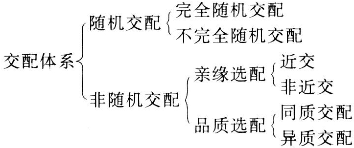某个性别的每个个体都有同等的机会与另一性别中的任何一个个体交配。这是随机交配(random mating,panmixis)的典型概念(见随机交配)。但有时出于某种育种工作的需要而要求在避免全同胞交配或避免全同胞和半同胞交配的前提下实行随机交配。于是,随机交配出现了两类,一类是完全随机交配;另一类是不完全随机交配,即限制一定程度近交的随机交配。
